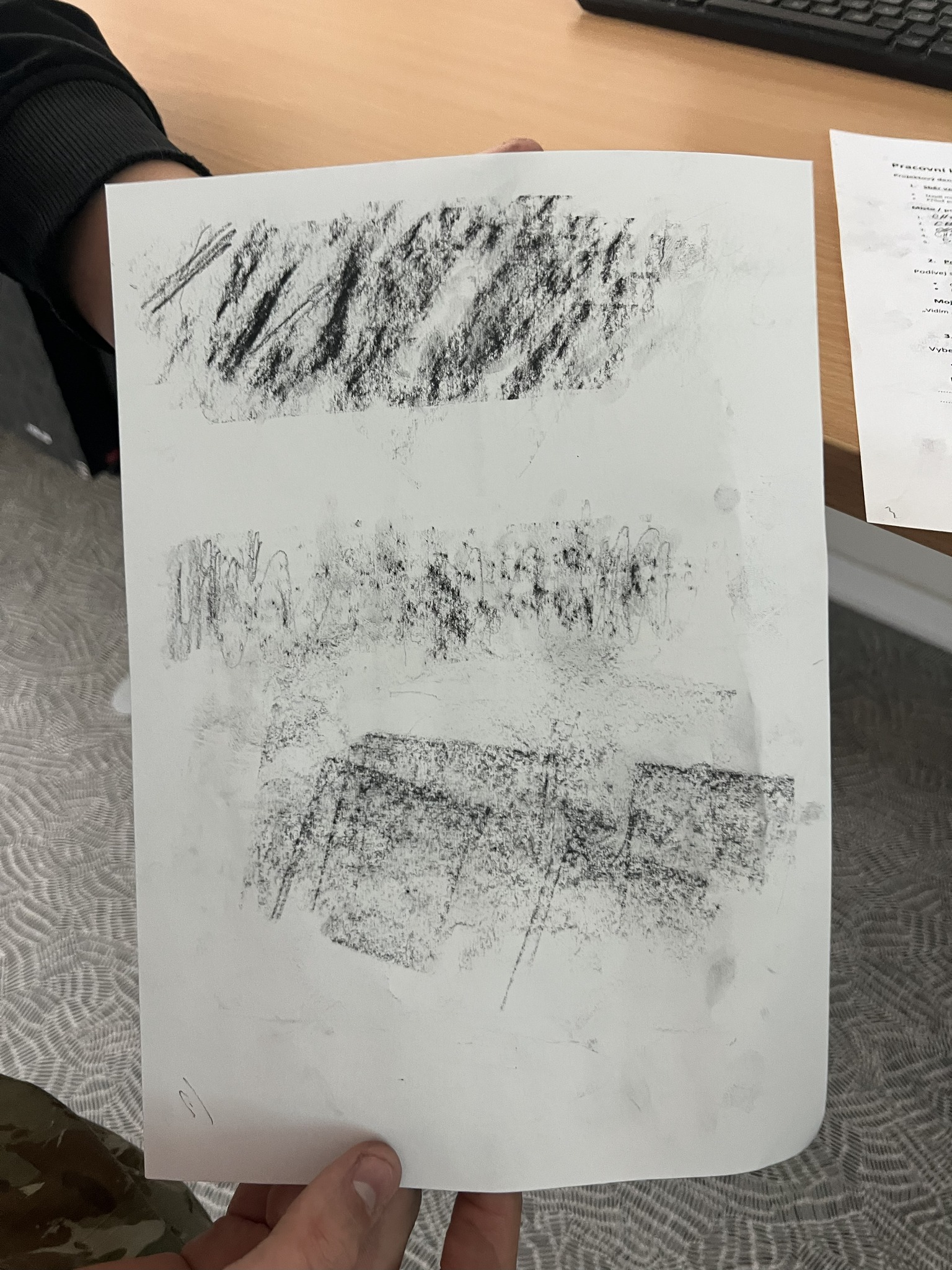 Následně se vydali do prostorů školy a pomocí uhlů, suchých pastelů a měkkých tužek zachycovali otisky povrchů, které je zaujaly – dřevo, zdi, kachličky či radiátory. Vzniklé frotáže jsme poté naskenovali do počítače a dále upravovali v programech Adobe Photoshop a Illustrator, kde z nich vznikly originální autorské pohlednice.