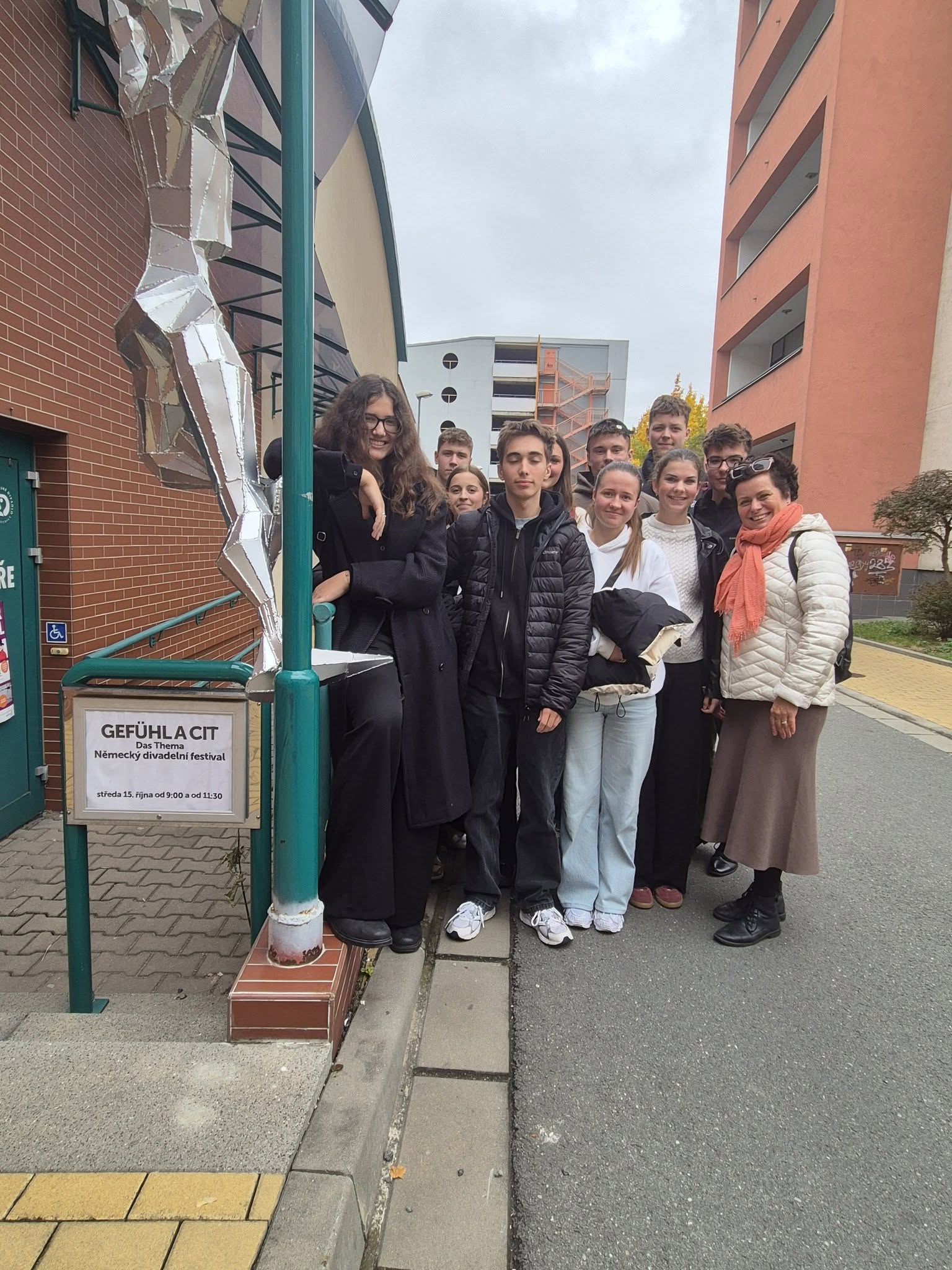 Ve středu 15. října jsme ve škole absolvovali první dvě vyučovací hodiny a poté jsme se vypravili do Pardubic, kde nás na Malé scéně ve dvoře čekalo představení německého kabaretu Das Thema s názvem Gefühl a cit. Toto představení se nám moc líbilo. Bylo vtipné, interaktivní, nechyběly písničky, hra na ukulele, ale ani vážnější témata, jako je hledání vlastních kořenů či identity. Herci, kterými byli dva Němci a jeden Švýcar, mluvili perfektně německy, ale snažili se i česky, protože v Čechách už nějakou dobu žijí. Ukázali nám, že to nejsou žádní „suchaři“, že i Němci umí být veselí, upovídaní, romantičtí, vášniví, zkrátka se jim podařilo zbořit některé předsudky, které máme my Češi o Němcích. Z německých představení, která jsme viděli, hodnotíme toto jako nejlepší. Užili jsme si ho naplno a moc děkujeme.